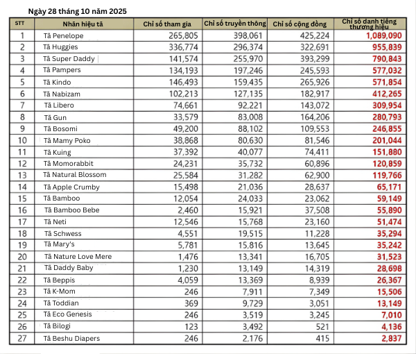 Viện Nghiên cứu Danh tiếng Doanh nghiệp Hàn Quốc đã tiến hành phân tích danh tiếng thương hiệu bằng dữ liệu lớn trên 27 thương hiệu tã phổ biến trong số người tiêu dùng Hàn Quốc. Phân tích này bao gồm 6.259.520 dữ liệu lớn về các thương hiệu tã được thu thập từ ngày 28 tháng 9 năm 2025 đến ngày 28 tháng 10 năm 2025. Con số này tăng 2,07% so với 6.132.281 dữ liệu lớn về các thương hiệu tã được thu thập vào tháng 9.