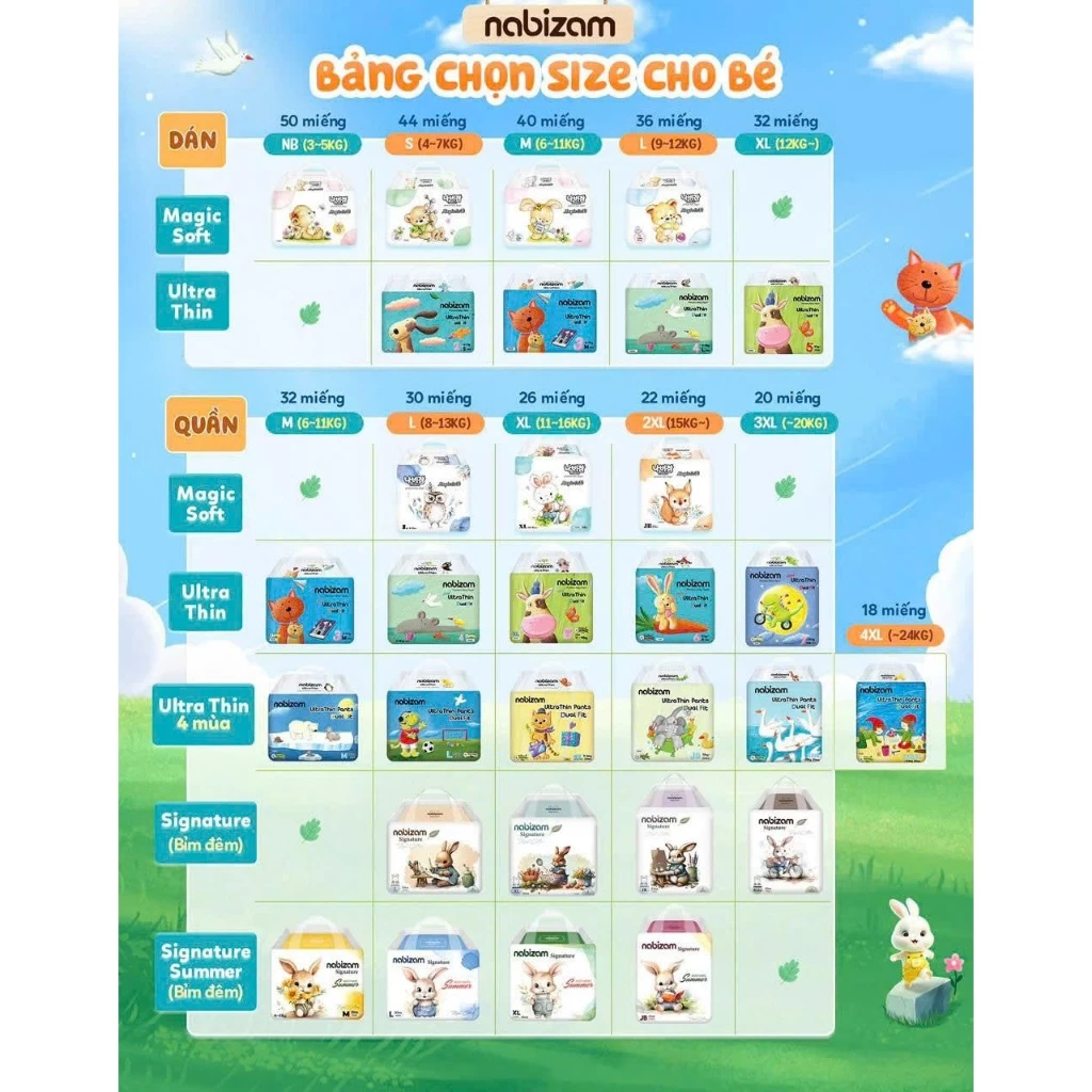 Bạn đang tìm kiếm bỉm Nabizam chất lượng cao, an toàn cho làn da nhạy cảm của bé? Là thương hiệu tã bỉm nội địa Hàn Quốc hàng đầu, Nabizam không ngừng cải tiến để mang đến những sản phẩm vượt trội về độ mềm mại, thấm hút và chống tràn. Với hơn 19 năm kinh nghiệm (ra mắt từ 2006), Nabizam đã chinh phục hàng triệu bà mẹ nhờ chứng nhận SGS quốc tế về an toàn sức khỏe. Năm 2025, dòng bỉm Nabizam Magic Soft được nâng cấp toàn diện, tập trung vào sợi vải siêu mềm, đai chun đàn hồi và lõi thấm hút SAP mạnh mẽ hơn 35% so với thế hệ trước. Hãy cùng cập nhật chi tiết các dòng bỉm Nabizam mới nhất để chọn size phù hợp cho bé từ sơ sinh đến trên 24kg!
