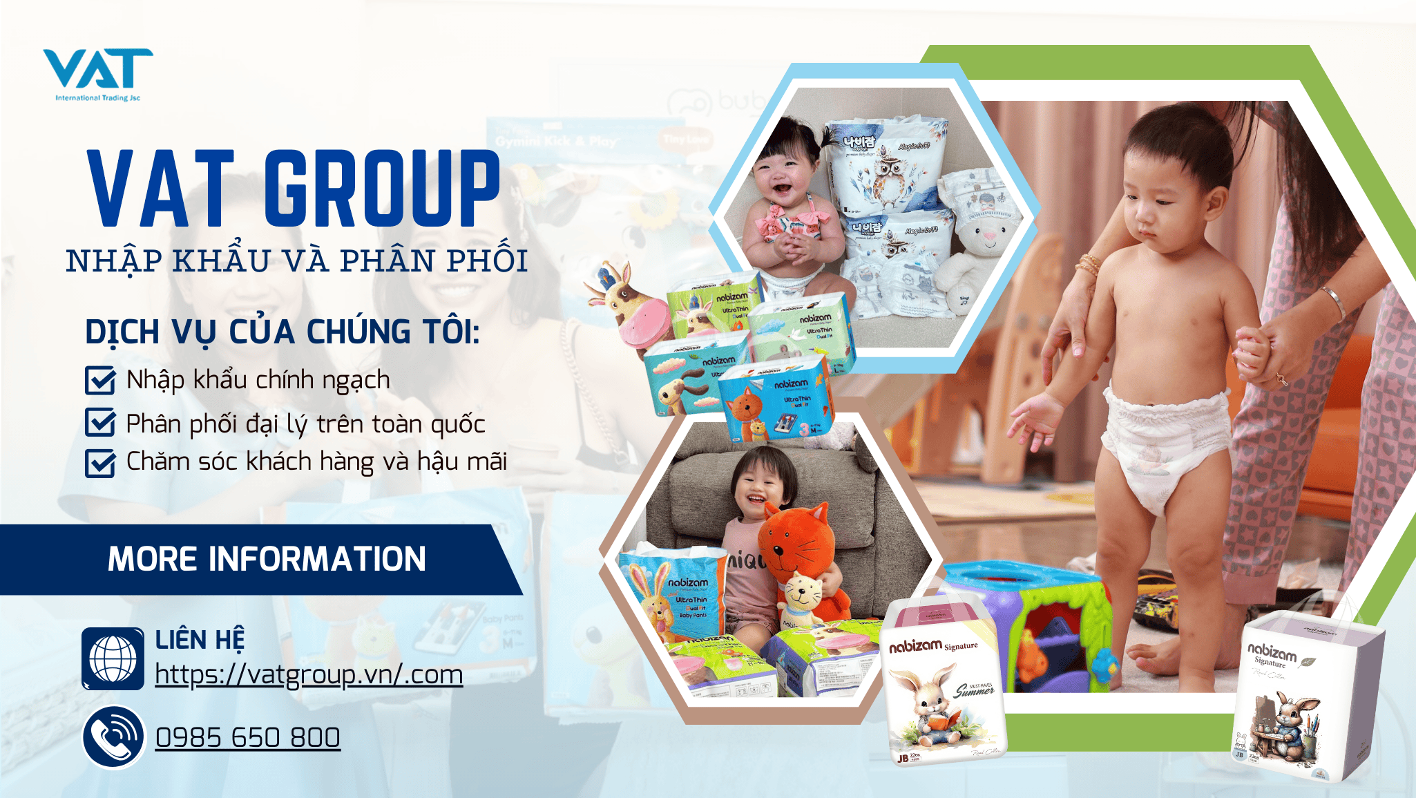 Công ty Cổ phần Thương mại Quốc tế VAT (VAT Group) là đơn vị chuyên nhập khẩu và phân phối các sản phẩm mẹ & bé cao cấp, đặc biệt là bỉm Hàn Quốc Nabizam – thương hiệu nổi tiếng với chất lượng vượt trội và độ an toàn tuyệt đối cho làn da nhạy cảm của trẻ nhỏ.
