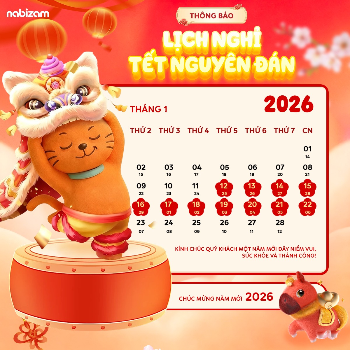 THÔNG BÁO LỊCH NGHỈ TẾT NGUYÊN ĐÁN BÍNH NGỌ 2026